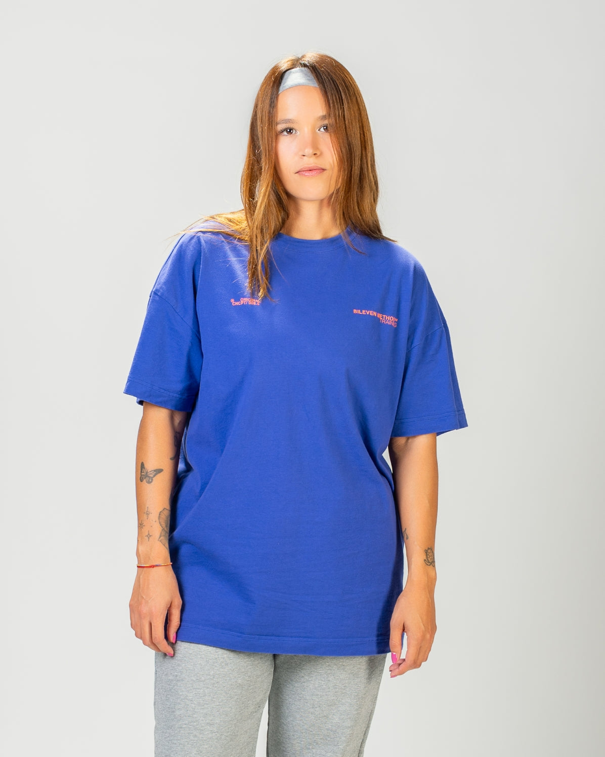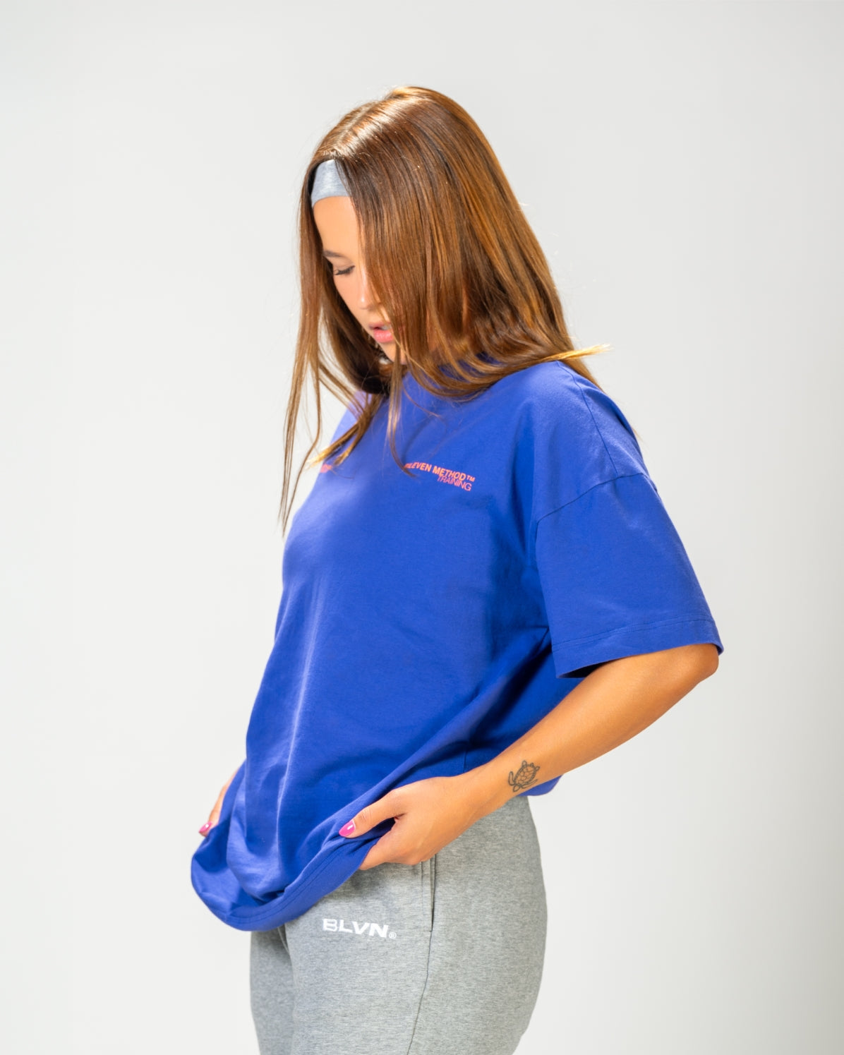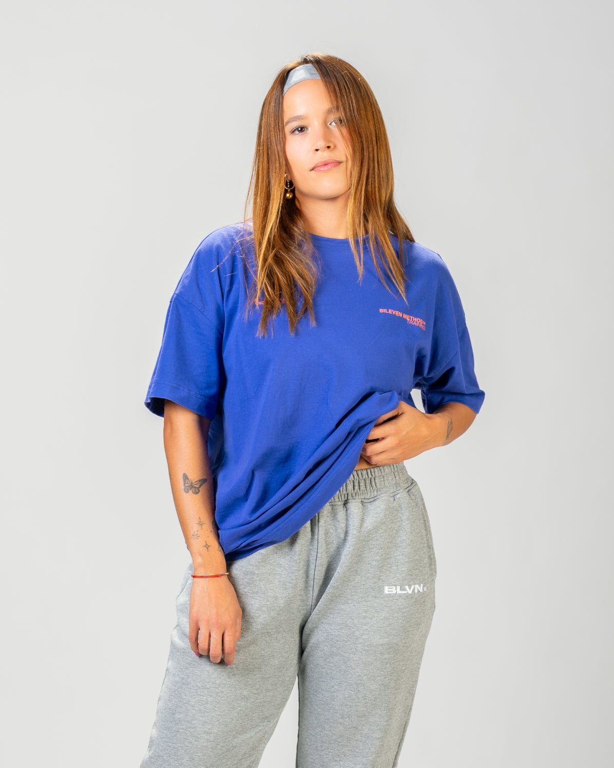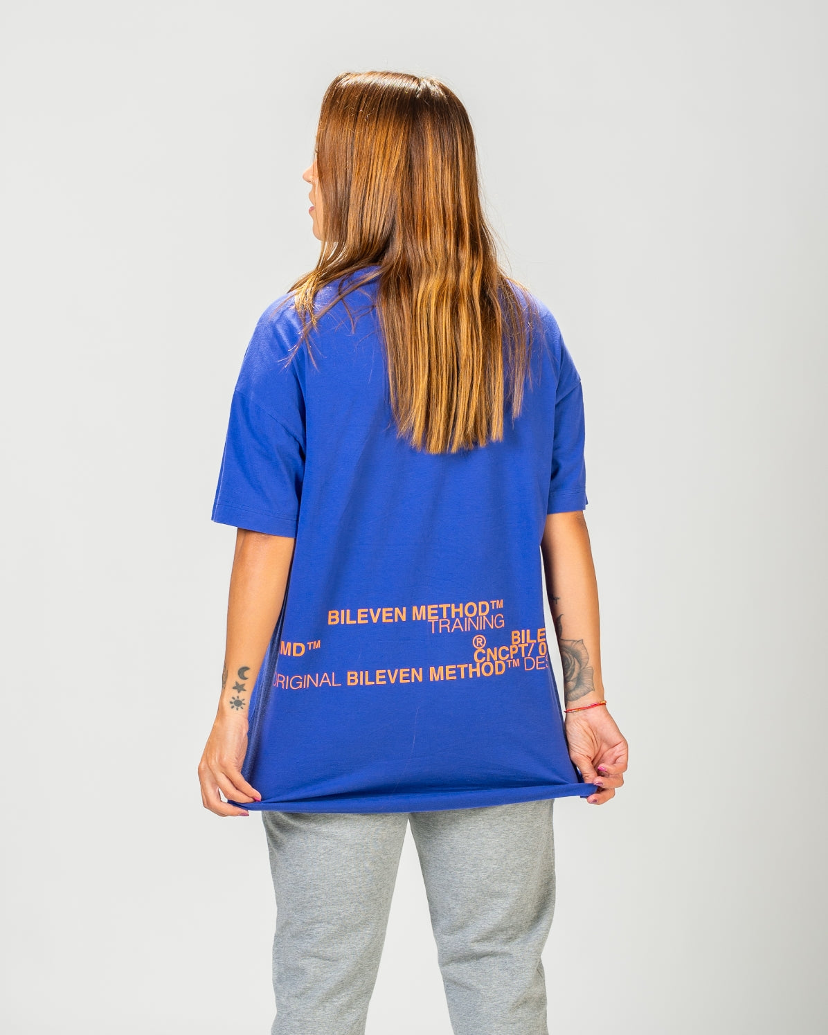 For those who want to stand out and be original. Perfect T-shirt for training due to its oversize cut, its elasticity and its soft cotton touch. Design in blue-lilac color in contrast with orange.